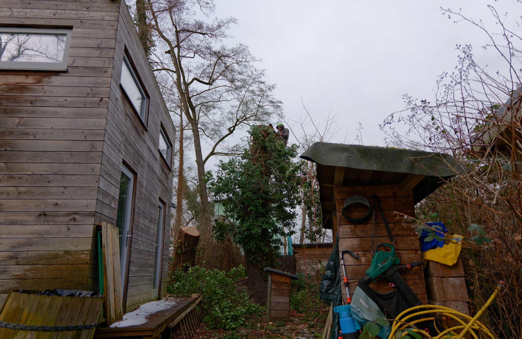 Große, alte Pappeln sind – insbesondere in direkter Nähe zu Gebäuden und Grundstücksgrenzen – nicht zu unterschätzen. Um Schäden an Haus, Zaun und angrenzenden Flächen auszuschließen, haben wir den Baum stückweise abgetragen. Jedes Teilstück wurde mit Seilen gesichert, kontrolliert abgelassen und anschließend sicher entfernt. So blieb der Arbeitsbereich jederzeit kontrolliert und die Umgebung bestmöglich geschützt.