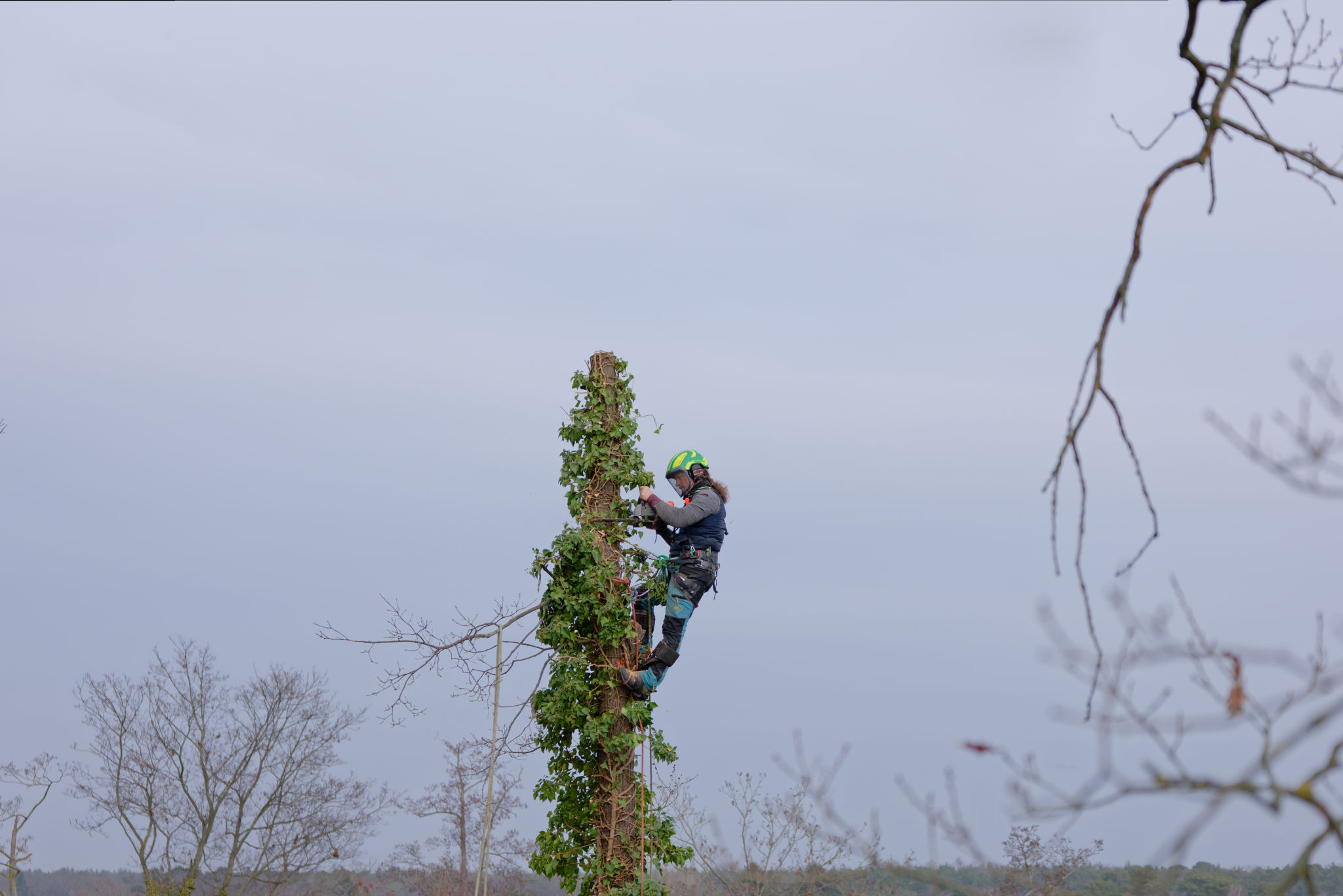 Wo es möglich und sinnvoll ist, denken wir bei Baumarbeiten auch an den ökologischen Mehrwert. In diesem Fall haben wir einen Teil des Stammes als stehendes Totholz belassen, damit er weiterhin als natürlicher Lebensraum auf der Insel dienen kann – zum Beispiel für Insekten, Vögel und andere Kleinstlebewesen. So bleibt trotz notwendiger Verkehrssicherung ein Teil der Struktur für die Natur erhalten.